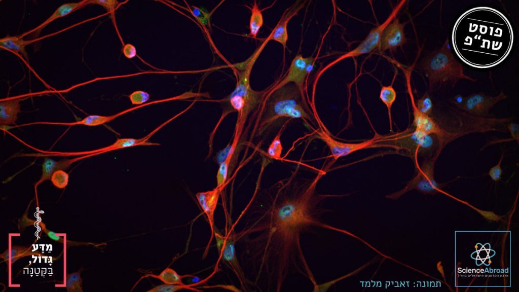 בתמונה: תרביות תאי עצב מוטוריים שיוצרו במקור מתאי עור של חולים. באדום - תאי עצב; בירוק - TDP-43; בכחול - גרעין התא. קרדיט: זאביק מלמד
