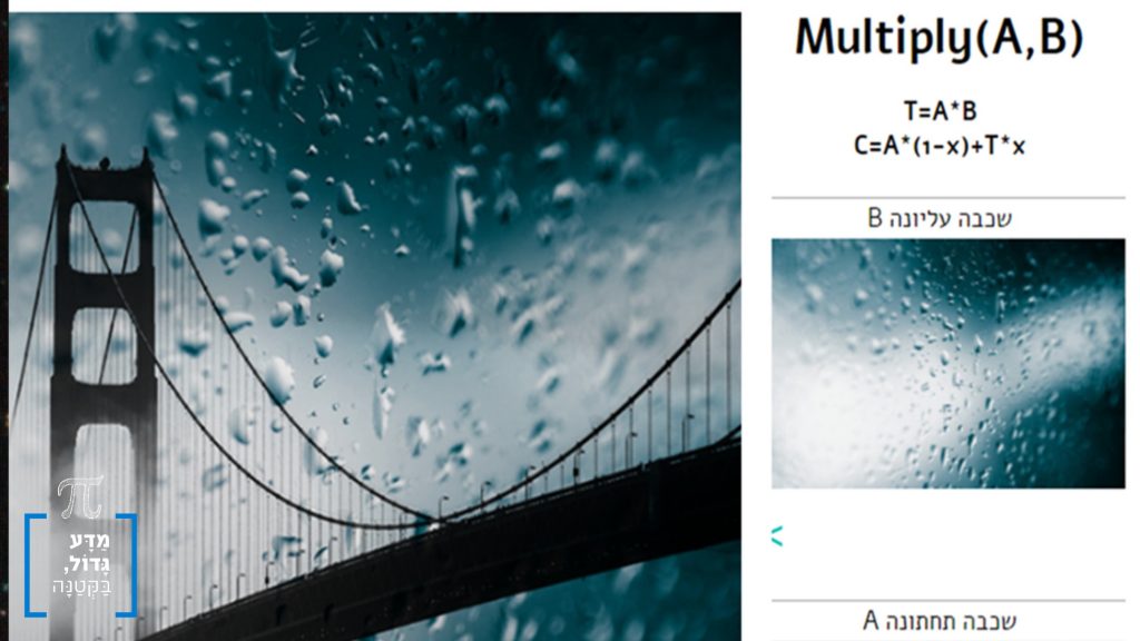 אם יש לנו תצלום שלה, נוכל לשים עליה ניילון שקוף חלקית בצבע אפרפר שנקרא לו B. מכיוון ש־B מסנן חלק מהאור, התמונה תראה כהה יותר. למשל, האזורים בתמונה שצבעם לבן (=1) ייעשו אפורים יותר (0.8 למשל).