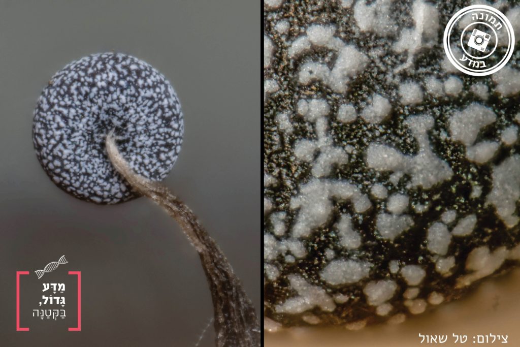 פטריריות, או רירניות – שעליהן כתבנו בעבר [2] – הן אורגניזמים יוצאי דופן: הן אינן פטריות וגם לא בעלי חיים, אלא יצורים חד־תאיים דמויי אמבות. יצורים אלו מבלים חלק ניכר מחייהם כגוף זוחל וניזון, ובהמשך מתארגנים לגופי פרי לשם הפצת נבגים. מינים רבים של פטריריות (כמו זו שבתמונה) אוספים מסביבתם סידן מומס, ובעת יצירת גוף הפרי משקעים אותו כסידן פחמתי אמורפי – כלומר חסר מבנה גבישי מסודר – בתוך רשת אורגנית של חלבונים ורב־סוכרים. כך נוצר מעטה גירני, הנראה בבירור בתמונה בהגדלה הגבוהה. מעטה זה עוטף בעיקר את הדופן החיצונית (הפרידיום), ובמינים מסוימים הוא עשוי להופיע גם בחלקים נוספים של גוף הפרי [3]. שכבה מינרלית־ביולוגית זו מקשיחה את המבנה הרך, מגינה על הנבגים מפני פגיעה והתייבשות, מייצבת את גוף הפרי הזעיר ומאפשרת לו ולהתנודד בעדינות באוויר – ובכך מסייעת לפיזור יעיל של הנבגים [4].