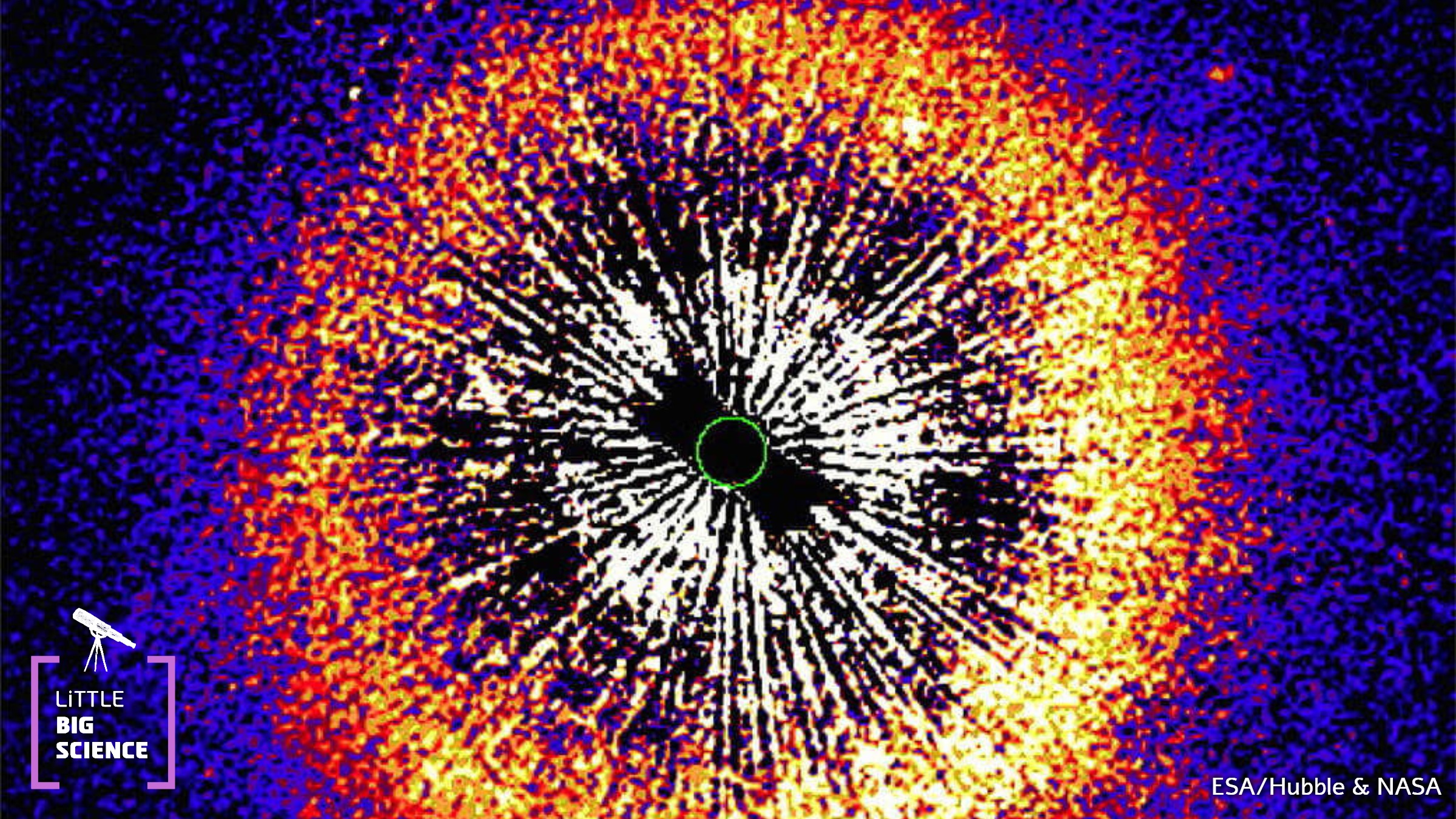 In the image, the star (masked by a black disk edged in green that blocks its light) is surrounded by an orange-highlighted ring. This ring, which probably resembles a three-dimensional bagel, is a reservoir of material orbiting the star that contains gas, dust, and rocks of various sizes, from dwarf planets to asteroids. Scientists suspect that every star, like our Sun, has a similar disk. However, because the objects within it do not emit light, they cannot be observed with an ordinary telescope. During the transit of HD 107146 in front of the distant galaxy, the material disk obscured the galaxy’s light and gave us a fleeting glimpse of the disk’s structure and composition.