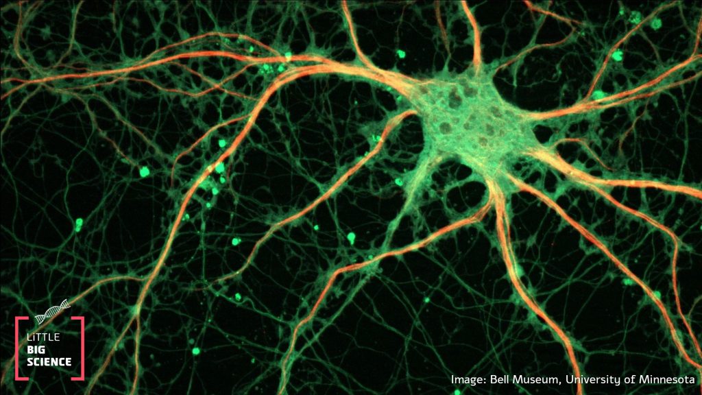 The basic computational unit of the brain is the neuron. These cells consist of many processes that receive signals from neighboring neurons (dendrites), a cell body, and a long, thin process that sends electrical signals (the axon). Neurons communicate through connections called synapses—contact sites between one neuron and another that enable them to transmit signals and thus convey and process information within the nervous system.