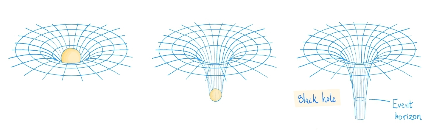 Assuming spherical symmetry and a vacuum, Schwarzschild's solution revealed how space (or a stage in our metaphor) would bend if a sphere were placed at its center. However, his solution also revealed a strange phenomenon: if a spherical body of fixed mass is compressed beyond its so called Schwarzschild radius, the surrounding spacetime becomes so severely distorted, that nothing, not even light, can escape. This is a black hole. The surface of spacetime that acts as a one-way passage, beyond which nothing can exit, is called the event horizon. Why “event” horizon? Because no event occurring inside it can influence what happens outside, since neither matter nor radiation can escape.