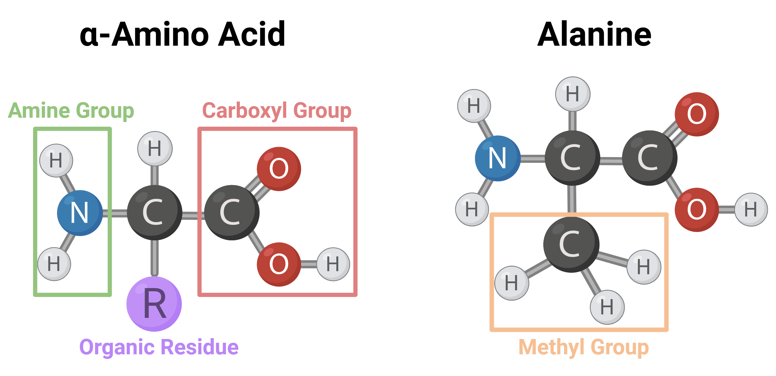 Left: the general structure of an α-amino acid. Right: the structure of alanine, one of the amino acids essential for normal human function.