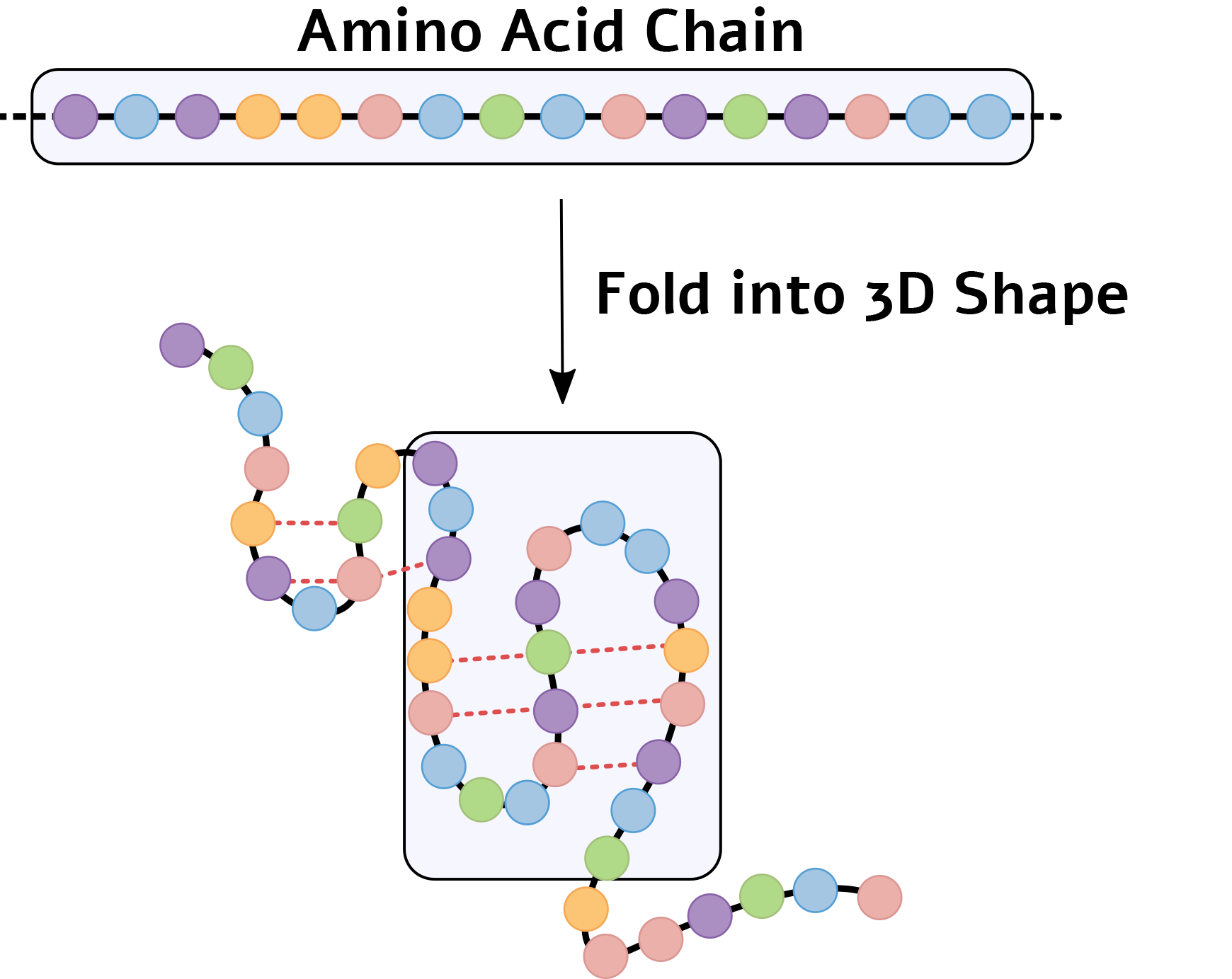 A schematic example of the folding of an amino-acid chain into a 3D structure. The 3D shape is stabilized by interactions between different amino acids (dashed red lines).