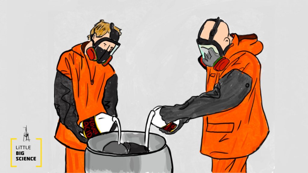 In another scene, Walter White and his partner in crime Jesse Pinkman dissolve two drug dealers corpses in hydrofluoric acid (HF) in an attempt to dispose of them. White instructs Pinkman to buy polyethylene plastic tubs, so that the acid will not eat through the container [2], but Pinkman opts for a porcelain bathtub instead. The powerful acid dissolves not only the bodies, but also the tub and the floor.