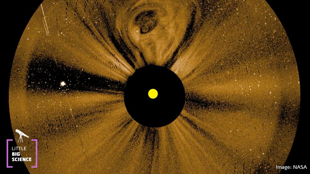 This frame from the video shows a coronal mass ejection (CME) in the upper part of the Sun. Particles can be seen rising through the solar atmosphere, marking the transition from the corona to interplanetary space. Note that the Sun itself is hidden from the camera’s view to prevent sensor saturation. Sensor saturation from the Sun, would prevent us from observing the corona and heliosphere.