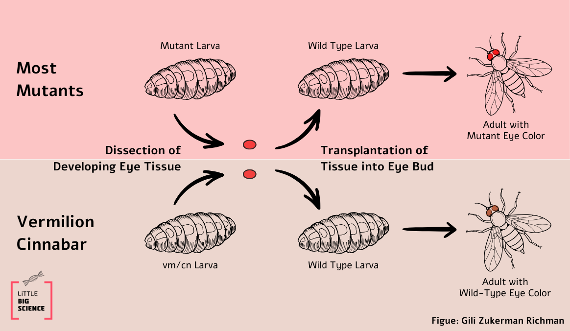 This claim is true for most of the mutants, except for two: Vermillion (vm) and Cinnabar (cm). Transplanting eye tissue from larvae of these mutants into a wild-type larva produced a fly with the normal, wild-type eye color (see Illustration 1).