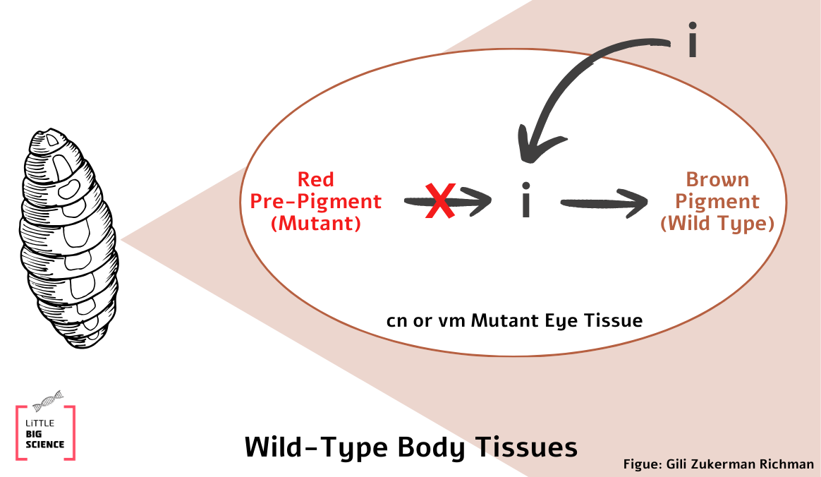 In this experiment, the adult fly was not produced by crossing, but by transplanting a mutant eye tissue into a wild type body. This means that there was no mixing of the mutant DNA with that of the wild type. So how can this result be explained? The researchers hypothesized that the wild-type body supplies the mutant eye with the missing intermediate component that is required to complete the synthesis of the eye pigment (call it i, see Illustration 2). If so, this result indicates that mutant flies have a defective enzyme in the biochemical pathway of eye pigment production.