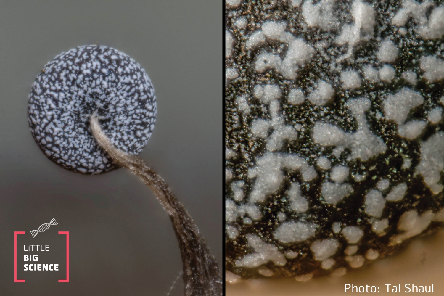 Slime molds, or myxomycetes [2], are extraordinary organisms: they are neither fungi nor animals, but single-celled amoeboid creatures. These organisms spend much of their lives as a creeping, feeding mass, and later organize into fruiting bodies for spore dispersal. Many slime-mold species (like the one in the image) absorb dissolved calcium from their surroundings and, during the formation of the fruiting body, cause it to precipitate as amorphous calcium carbonate—meaning it lacks an ordered crystalline structure—within an organic network of proteins and polysaccharides. This process creates a calcareous coating, clearly visible in the high-magnification image. The coating primarily envelops the outer wall (the peridium), and in certain species may also appear in other parts of the fruiting body [3]. This mineral-biological layer stiffens the otherwise soft structure, protects the spores from damage and from drying, stabilizes the tiny fruiting body, and allows it to sway gently in the air—thereby aiding efficient spore dispersal [4].